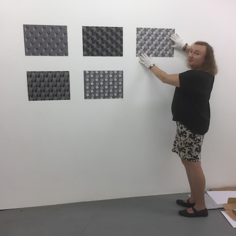 Christine Dean participates in the hanging of David Sequiera’s series, What Time Is Grey?, which forms part of Grey Area. Photo: AirSpace Projects.