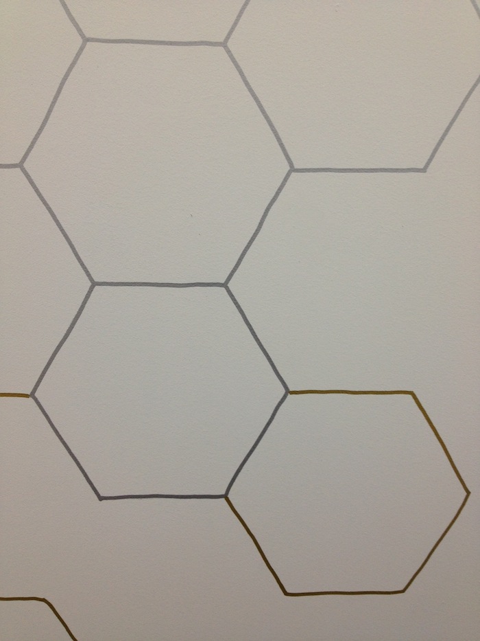 For the installation at AirSpace Projects the table-structure has been combined with a site responsive wall-drawing. The hexagonal shape used creates an open honeycomb structure that is spread across three of the gallery walls. The honeycomb shape and the gold and silver pen used to draw it alludes to the process of laboring as a mode of production for art making, as well as to the jewellery studios that adjoin the exhibition space.