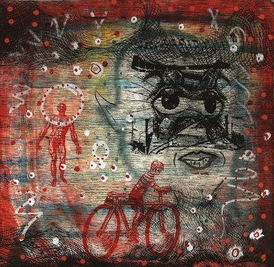My first bicycle ( a collaboration between Stephen Spurrier, Catherine Parker and Ron McBurnie) , 2014. Etching, screenprint and acrylic paint on paper, 20 x 20cm.