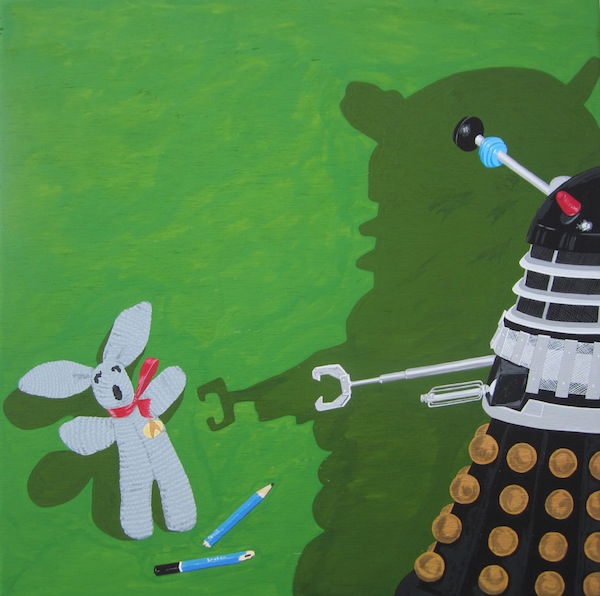 Fratingi the grey knitted Bunny from Kandos and the jilted lover of Giorgio Pengee can’t decide whether to fall in love with the Dalek or fight it with a broken pencil, 2014. Gouache on wood panel, 40 x 40cm.
