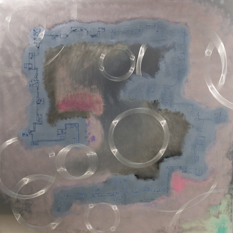 Jang uses her body to map the Sydney city area by undertaking a series of walks over a period of several months. Her routes are then reviewed and processed through Google maps and translated into a series of scratch holograms, an analogue technique of drawing on aluminium to make representations through light diffraction, reflection and interference. By allowing the elusive, moving effects of the scratch holograms and the line drawings in aluminium to co-exist, Jang balances the modalities of actual and virtual.