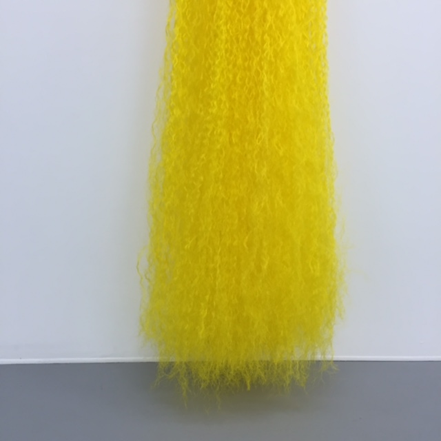 This work uses nylon rope to interpret the myth of the Golden Fleece. The ancient human method of washing gold from streams using animal fleeces as filters has been cited as the possible origin of the myth of the fleece. The work uses braiding and rope techniques to ‘tame’ the fleece while alluding to the ways in which sheep and other animals have been ‘used’ by humans in their desire for wealth and status.
