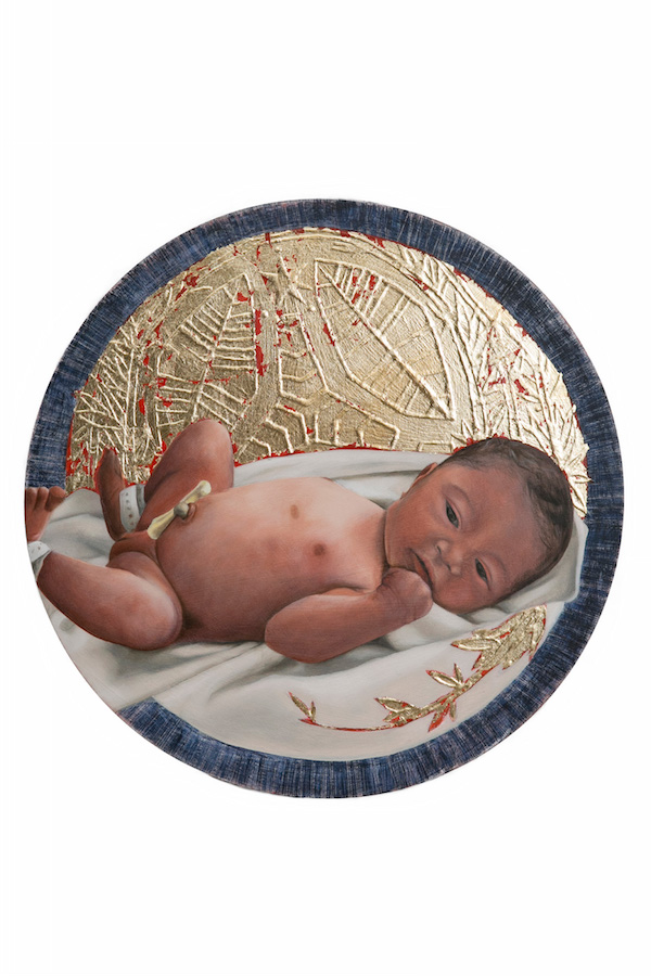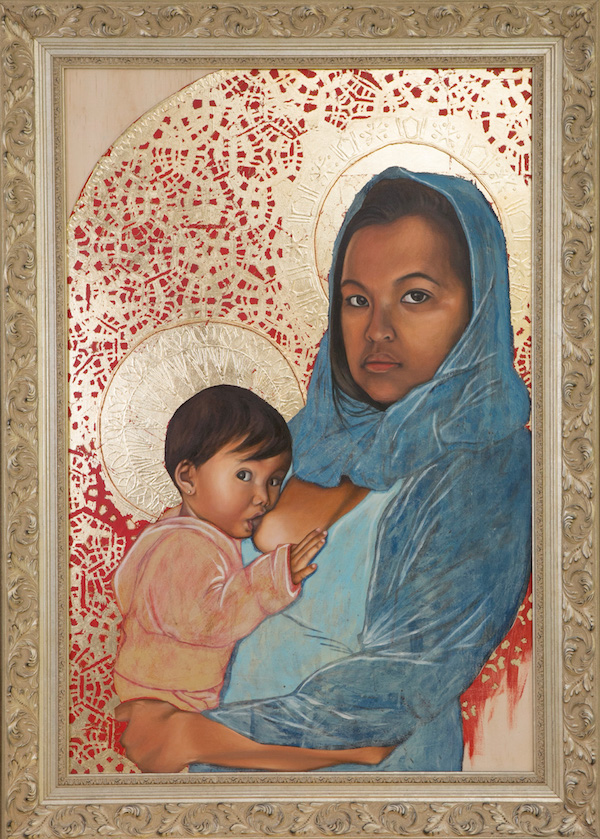 The Weaning Madonna, 2015, acrylic, oil, gold leaf, pyrography and PVA on ply, 97 x 77cm. Photo credit: Cassie Bedford.