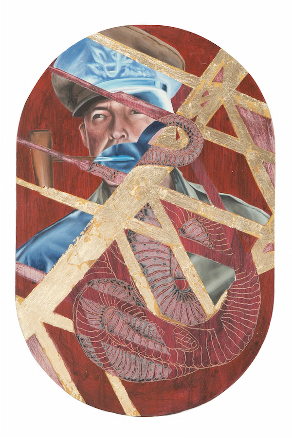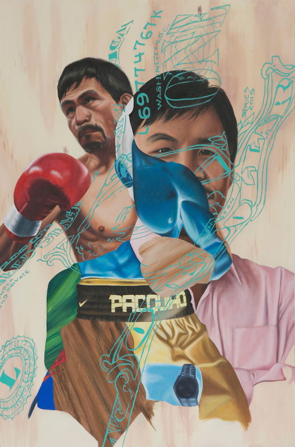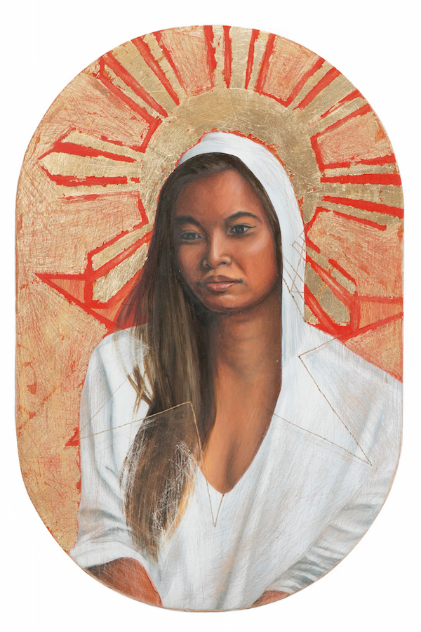 Many of these things – the current condition of the world, the love between her, Shawn and their families are among the subjects making up the exhibition Altar Ego. The figures in the paintings are easy to identify; if you know Marikit, you will be able to distinguish Josefina, Shawn and Maella. If you have knowledge of high-level sport will also recognise Manny Pacquiao, the first and only 8-division world-boxing champion. That you can determine who the individuals are within the paintings means that they are skilfully executed representations; even when veiled behind a heavy mantilla of geometric sgraffito, we can quickly ascertain who they are and guess at what they mean to the artist. The capacity to render out of nothing but observation and paint the semblance of another remains one of those great, abiding mysteries of art. Inexplicable and allusive, skill can be augmented, refined even amplified by training but if you don’t have it, no amount practice is going to realise it out of mere effort. Images like these require ability and patience. This means painting for Marikit can be partially understood as a meditative act, like prayer, which returns us to the title of the exhibition Altar Ego and my evocation of Neo-Medievalism.
