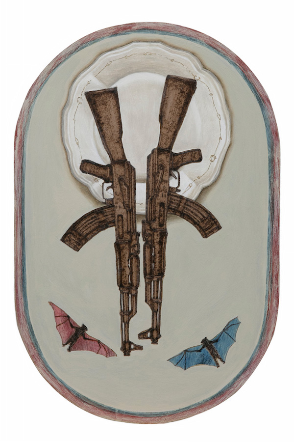 Rat Pac, 2015, acrylic and oil on MDF placemat, 31 x 21cm. Photo credit: Cassie Bedford.