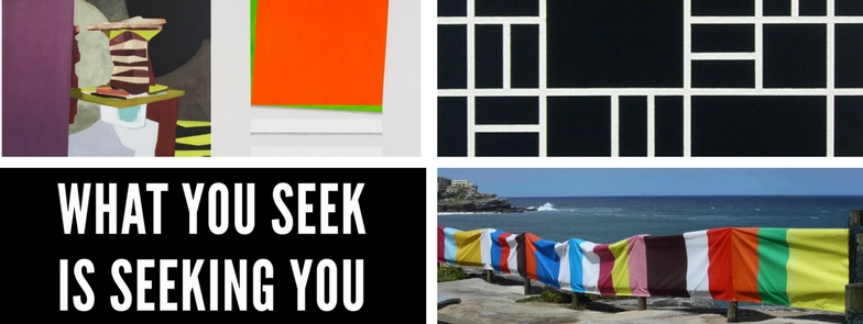 4 images from top to bottom: 1. LHS: Anthony Cahill, Cave & Moon #4, 2016, oil on linen, 90 x 90cm. Photo credit: Anthony Cahill. RHS: Pollyxenia Joannou, Shadow Whisper, 2016, oil, pigment on wood, 90 x 90cm. Photo credit: John McRae. 2. Kendal Heyes, Untitled #10, from Polynesia series, 2016, oil and crushed marble on velvet , 120 x 91.4cm. Photo: Kendal Heyes. 3. Francesca Mataraga, ‘photographic documentation of banner for Sculpture by the Sea 2014 (Tamarama)’. Image courtesy the artist. 4: Mog&Mog, Future self, 2016, digital image.